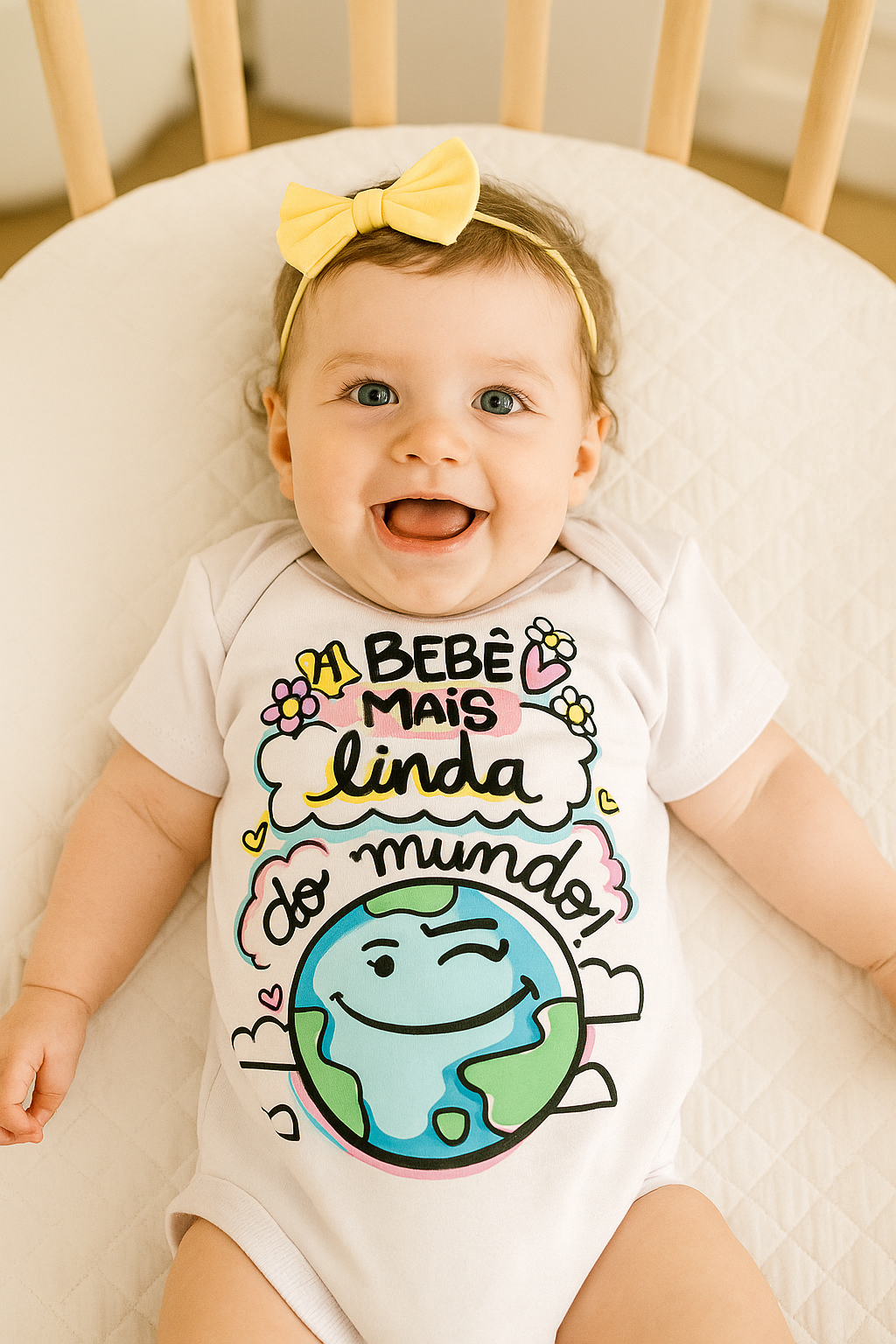 O Body “A Bebê Mais Linda do Mundo” é feito em 100% algodão antialérgico, trazendo o máximo de conforto e suavidade para a pele delicada da sua princesa. Com estampa digital colorida e duradoura, cada detalhe transmite carinho e alegria. 💕