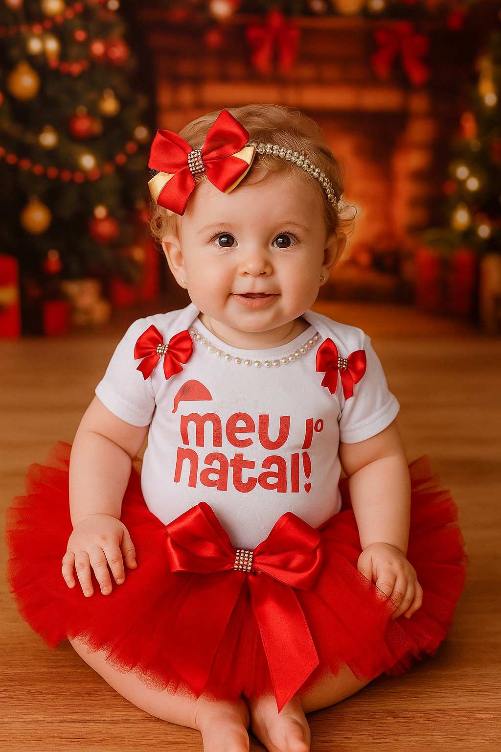 Registrar o primeiro Natal do seu bebê é criar lembranças que ficarão para sempre guardadas no coração da família. Com esse kit, sua princesa estará vestida de forma especial, encantadora e confortável para celebrar essa data tão mágica.