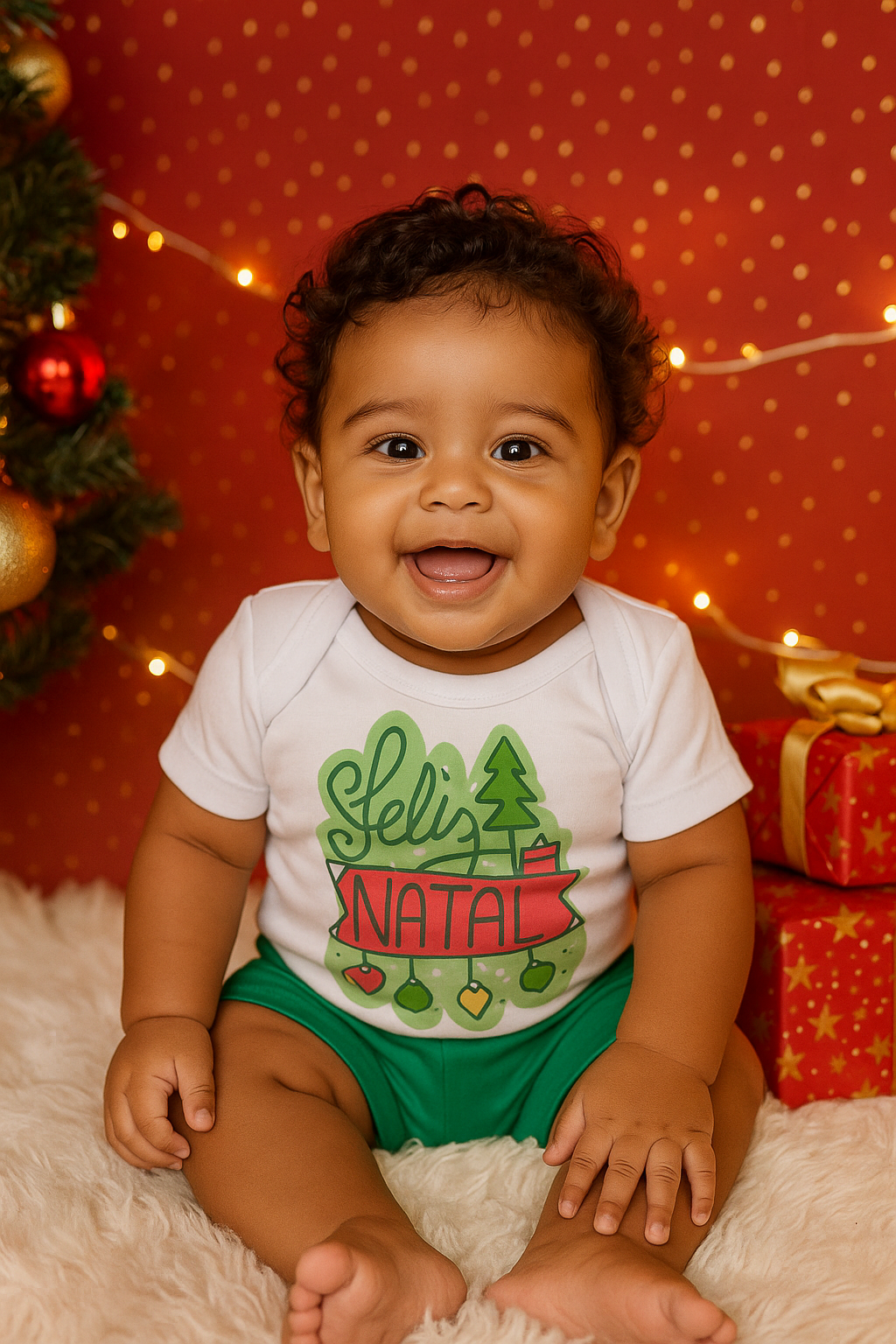 Shortinho verde: leve, confortável em algodão e com ótimo caimento, combina perfeitamente com a proposta natalina e garante liberdade de movimento para o bebê brincar e aproveitar cada momento.